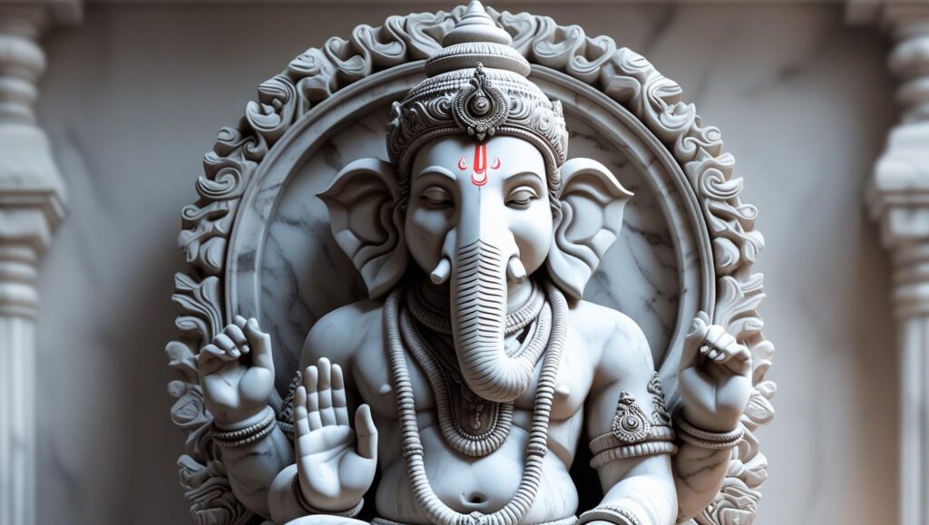 LORD GANESHA, THE REMOVER OF OBSTACLES, STANDS IN DIVINE GRACE, RADIATING SERENITY AND BLESSINGS, MAKING IT CAPTIVATING.